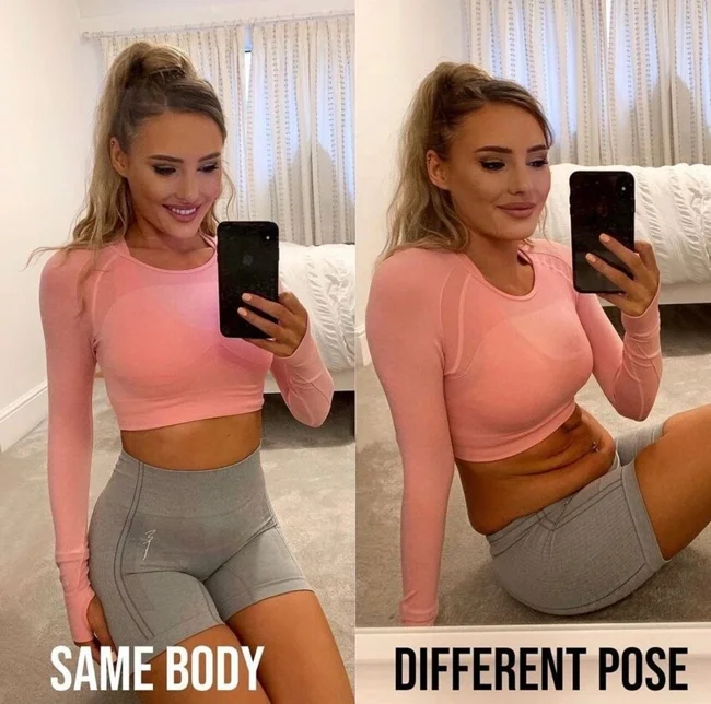This list includes: holding your breath, side lighting to emphasize the abs, moisturizing the skin or the so-called fake “sweat” so as not to emphasize cellulite, raising your legs on tiptoes and much more.