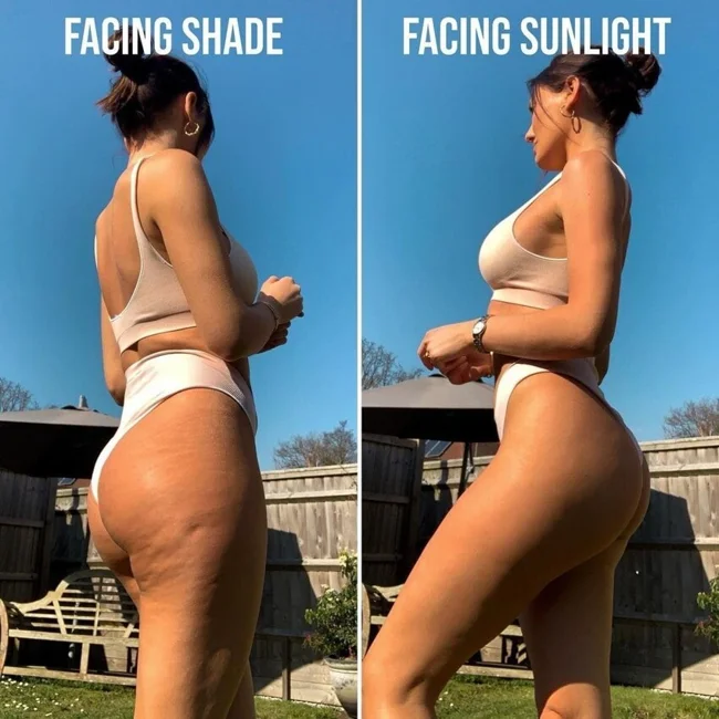 When the camera is pointed from the side and from below, and you are facing the shadow, the sharpest part of the light will fall on your body, highlighting your figure poorly. When you look directly at the sun, and the camera shoots from the side, this will soften the texture and light transition of the shadow on the skin, creating the effect of toned muscles.