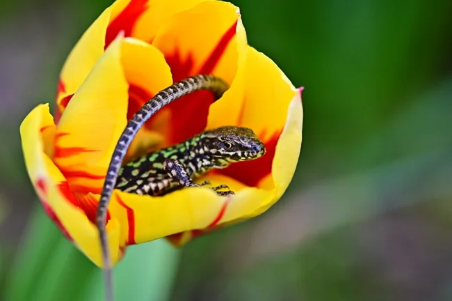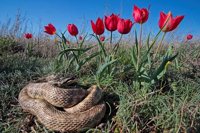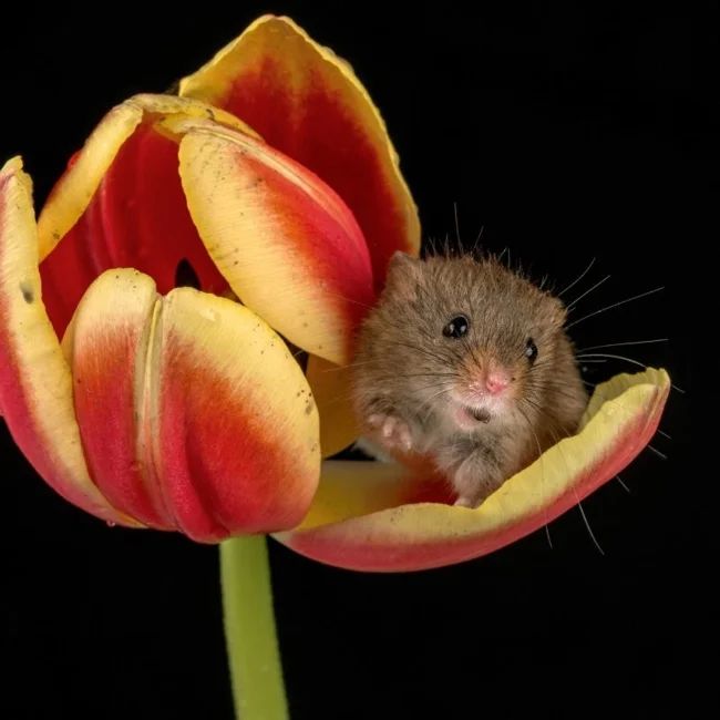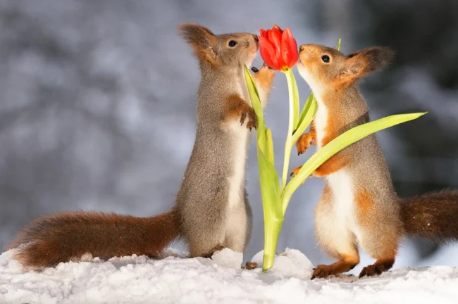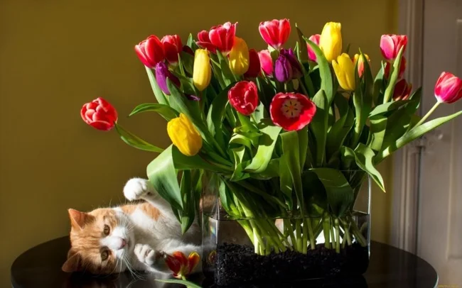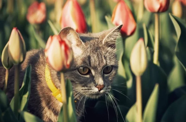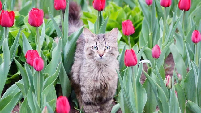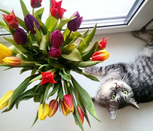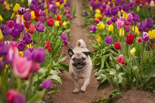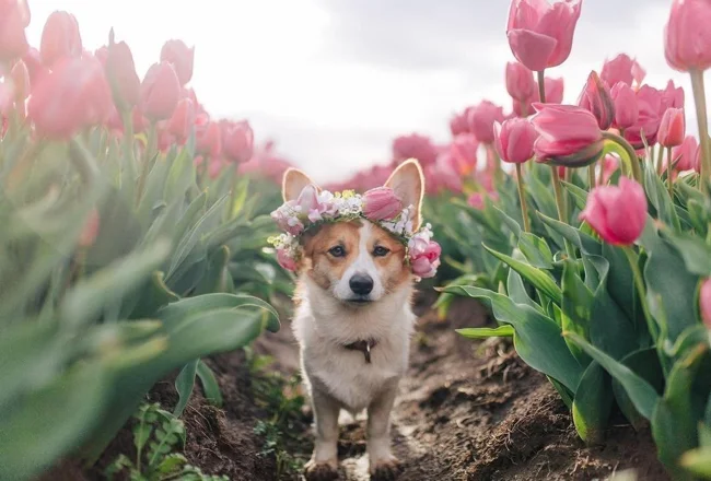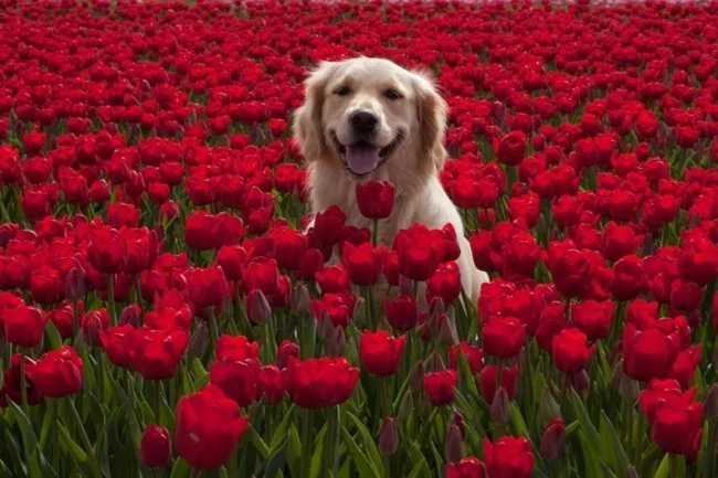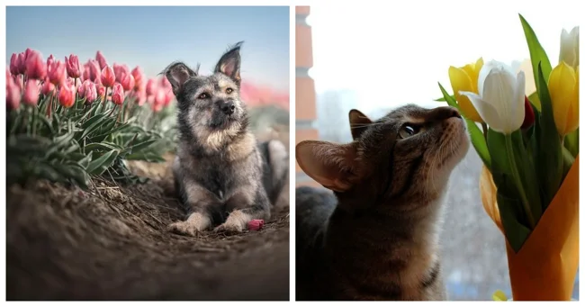 Not only people, but also our little brothers rejoice at flowers. For whom posing against the background of buds is a pleasure. And magical tulip moments are saved in the photo to give a good mood whole year.