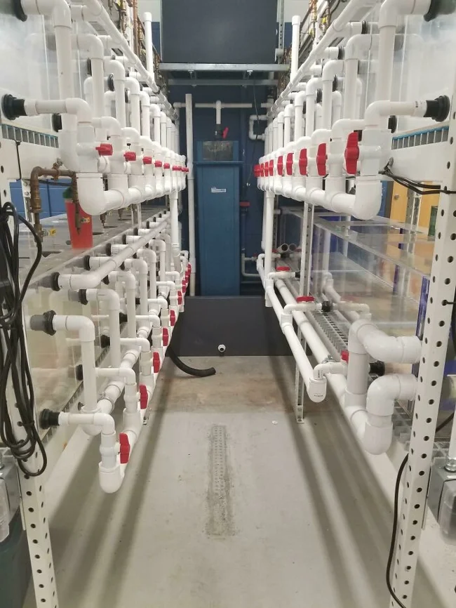 13. "Aquarium room where I piped. 31 tanks with individual air supply, water recirculation, overflow and drain"