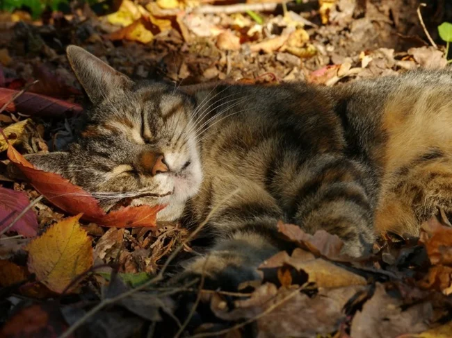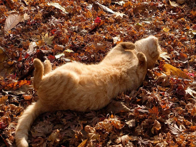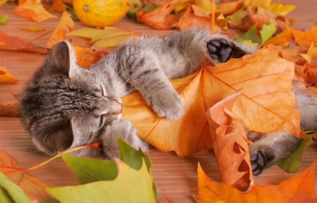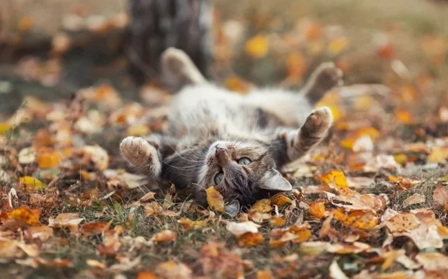 The beauty of bright autumn colors is appreciated not only by people, but also by cats. The decoration of the trees can be smelled, licked, even chewed. And also run around on the crimson-golden carpet, lie around and even bury yourself in it.