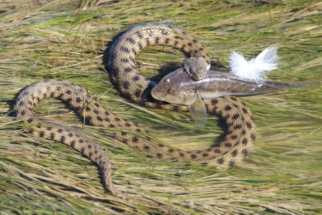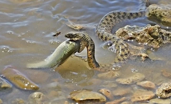But the water snake’s favorite dish is fish. It is capable of swallowing even a large pike. Any avid fisherman would be envious of such a catch, but the snake does not catch large gill-breathing snakes for trophies. And to save water bodies.