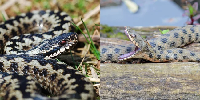 On the left is a viper. On the right - really. Determining where who is is really difficult. But you need to look it in the eye! The viper has angry eyes, like the main villain, and the snake has simple eyes, like the good, stupid hero.