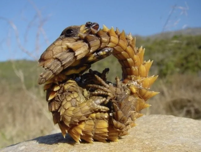 One of the most amazing reptiles: the lizard’s body is covered with real scales. There are thorns on the scales; when in danger, the animal curls into a ring, putting up protection. At the same time, it holds its tail tightly with its teeth so that it is impossible to untwist it. They are also called cordylids and African dragonets.