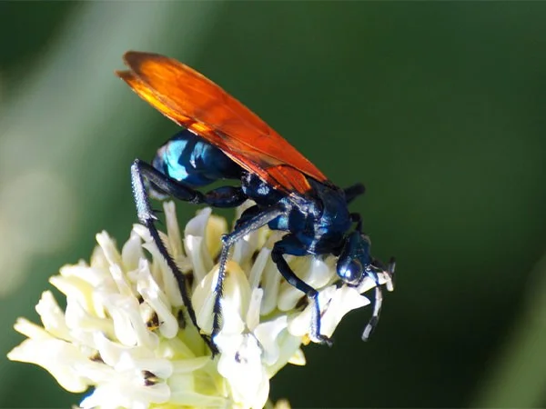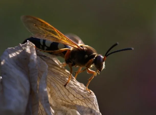 This wasp is known in the United States as the "Western Cicada Killer." They often lay their eggs in cicadas, which they then paralyze. Their bite is rated 1.5 on the Schmidt Pain Index.