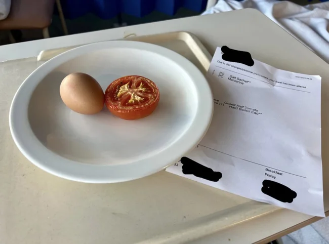 We present to you a hospital breakfast. This is a low carb, low sugar diet.