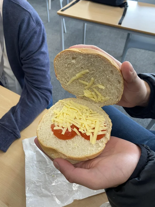 Bun with cheese and tomatoes. It's bingo!