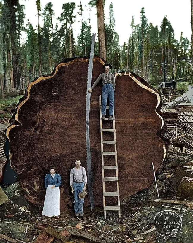 2. A family stands in front of a 1,341-year-old tree known as the "Mark Twain" tree. A 100 meter tall sequoia tree was cut down in 13 days in 1892 in the USA.