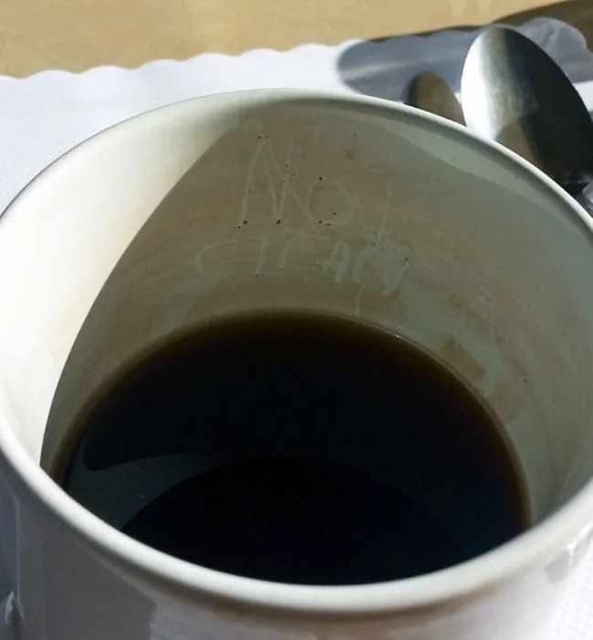 21. "I was having breakfast at a restaurant when I noticed this. It says 'Dirty.'