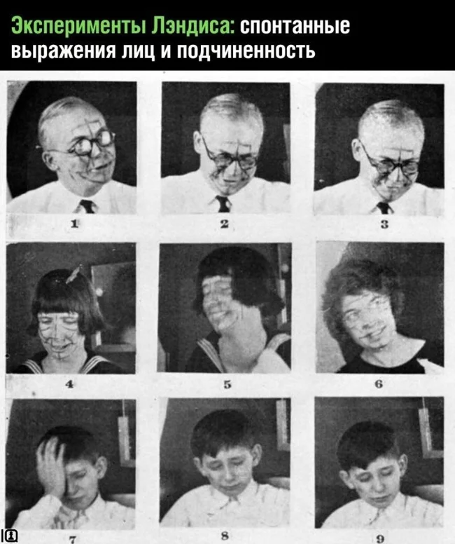Landis drew lines on the participants' faces to help classify emotions more accurately. And then he gave students to smell substances with a pungent odor, watch an excerpt from a film, listen to music, and voice some fact that does not correspond to reality. He recorded all the expressions in the photo.