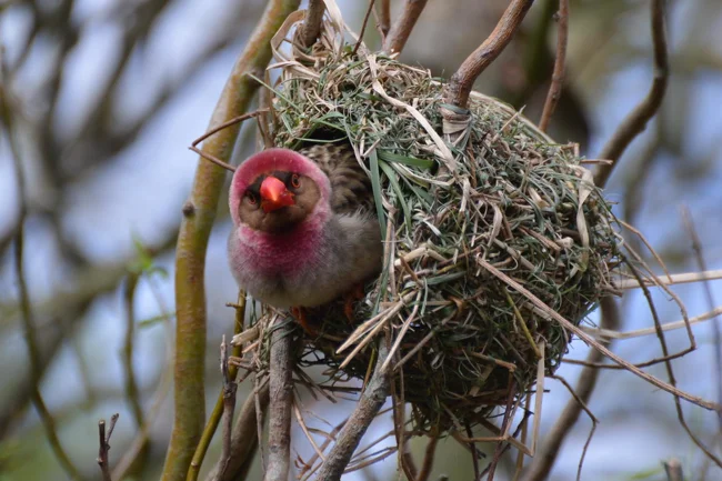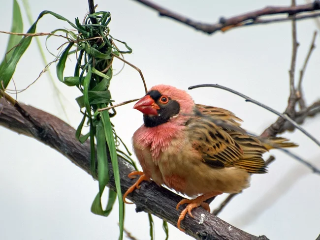 In the intervals between destruction and robbery, the birds love each other. The mating season occurs at the height of the rainy season. Males change their modest plumage to a flashy outfit and tint their lips. More precisely, the beak. The brighter it is, the higher the status of the bird in the group, and the more desirable the male is for a partner.