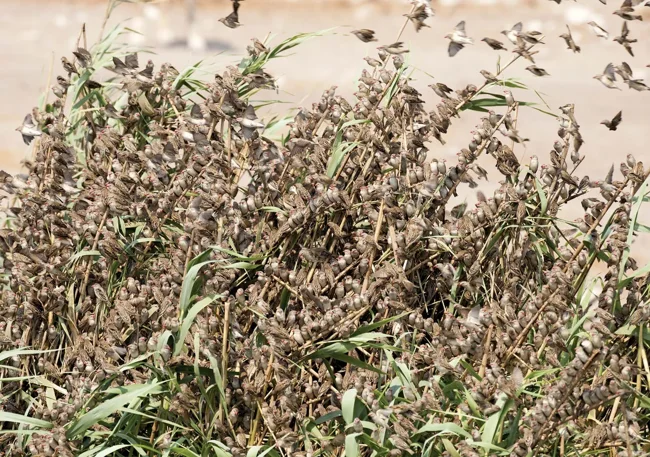 If the expression “eat like a bird” were written from red-billed weaver birds, it would mean eating by the carload! The basis of the birds' diet is seeds. Hungry hordes of birds attack human crops with impunity. Namibian scientists have calculated that a flock of 5 million adult birds and 5 million chicks destroys up to 1000 tons of seeds during the entire breeding season! With such appetites, it is not surprising that the birds were nicknamed feathered locusts.