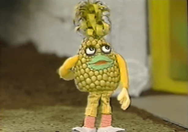The title of the program is “Téléfrançais!” It would be most correct to translate it as “Tele-French!” This is a Canadian show in French, designed to teach young viewers the French language. One of the main characters is a pineapple, which frightened the children watching the program.