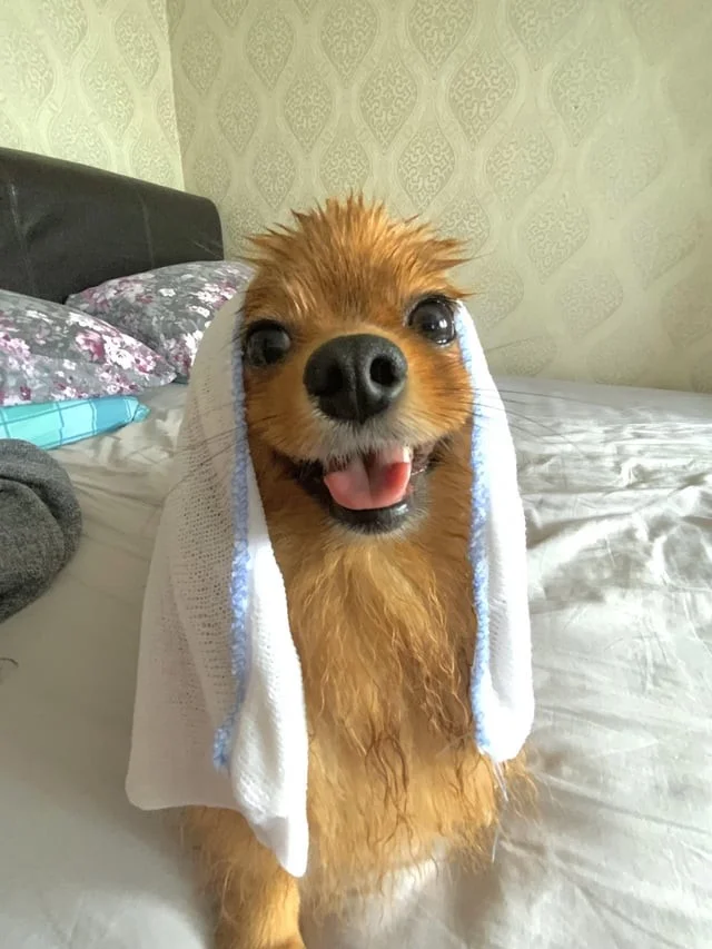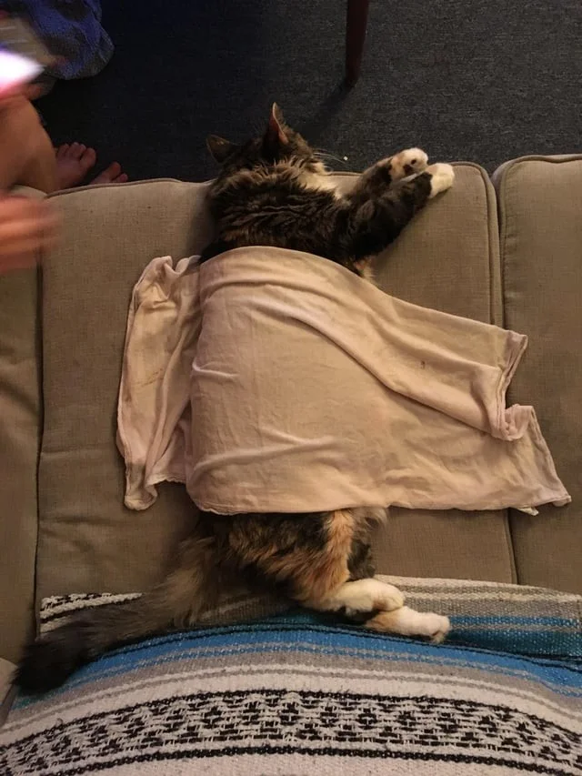 22. This cat hates water, but allowed herself to be covered with a wet towel.