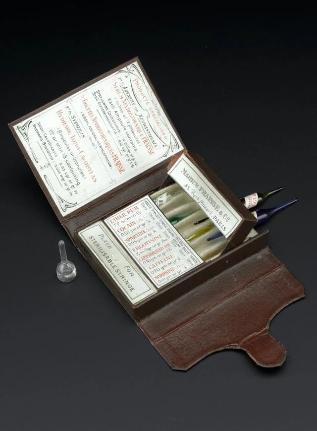 First aid kit with 7 glass ampoules - with ether, cocaine, morphine and caffeine. France, 1900-1910 ![]()