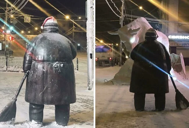 Sculpture of a janitor from Yakutsk, the peculiarity of which is that the figure always turns his back to the viewer