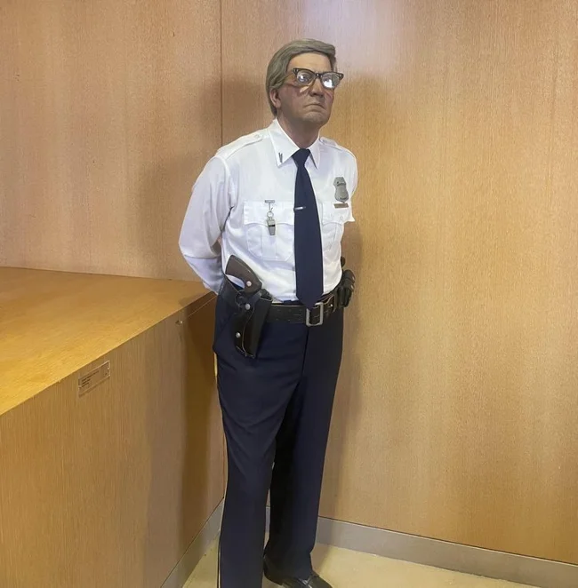 Wax figure of a security guard at a bank in Beverly Hills