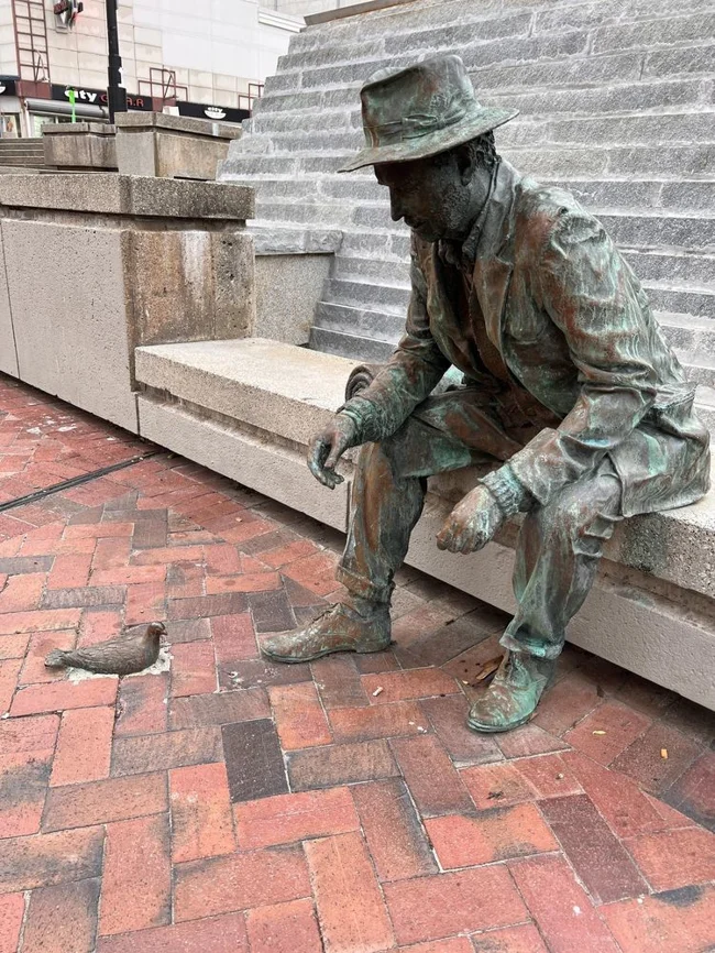 Statue of a man and a small dove that he feeds. I wonder how many people didn't notice the bird and tripped over it?
