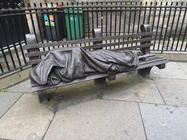 Homeless man statue on a bench in Glasgow, Scotland