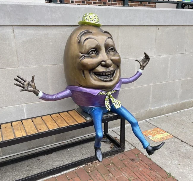 "Humpty Dumpty statue located outside my town's library"