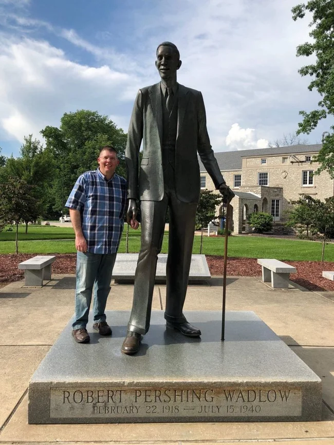 “I, 1.8 meters tall, stand next to the statue of the tallest man in the world, Robert Wadlow, who was 2.72 meters tall.”