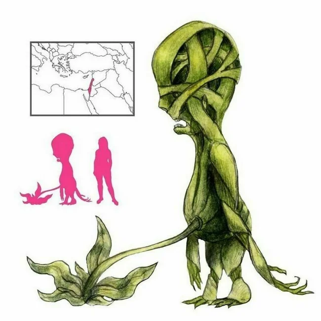 The green monster from Jewish tales, Yedua, which is connected to the earth by a protrusion from the navel