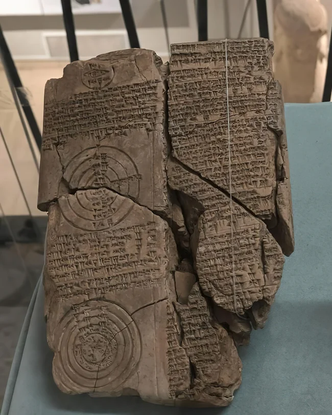 15. The Iraqi museum houses an ancient clay tablet discovered in Uruk (Warqa) in southern Iraq. This tablet is covered in cuneiform and has three geometric circles containing astronomical calculations