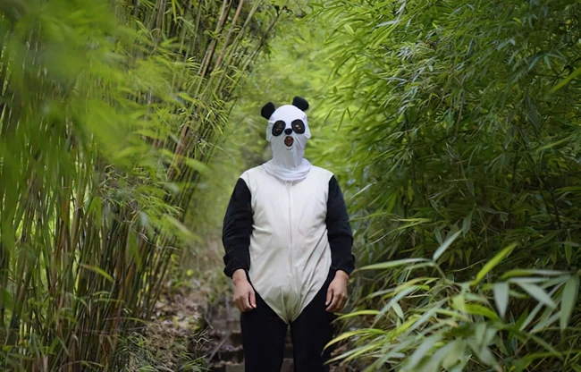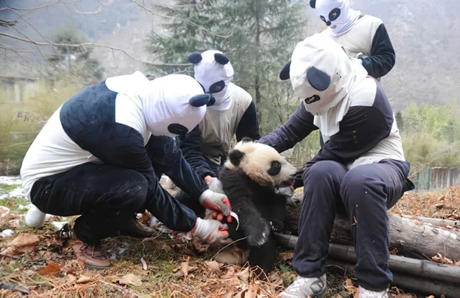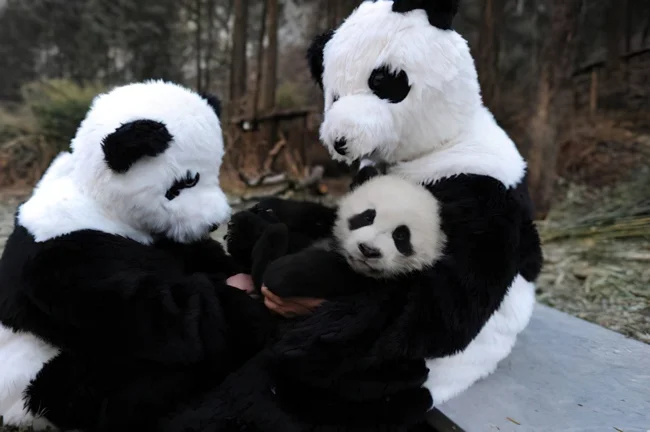 10. Keepers of a panda sanctuary in China wear disguises to avoid scaring the cubs and help them get used to life in nature.