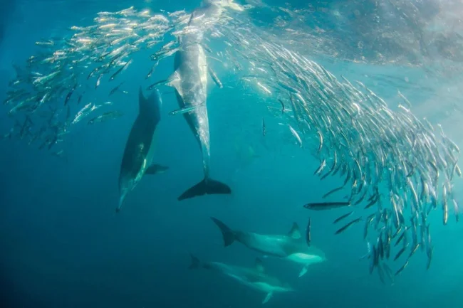 To get enough food, dolphins have to hide. Therefore, a school of dolphins always sends the most experienced ones forward. If the school of provisions is of such a size that the whole group can feed itself with it, then the messenger will appear to the comrades, and the flock will surround the fish. By gradually tightening the ring, the dolphins will force the fish to move in a circle. All the dolphins have to do is open their beaks and eat.
