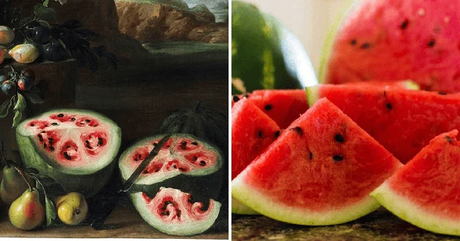 For anyone interested in what the ancestor of the watermelon looked like before, breeders refer to a painting by the artist Giovanni Stanchi, painted between 1645 and 1672. You can notice that there was much less pulp in it than in today's watermelon.