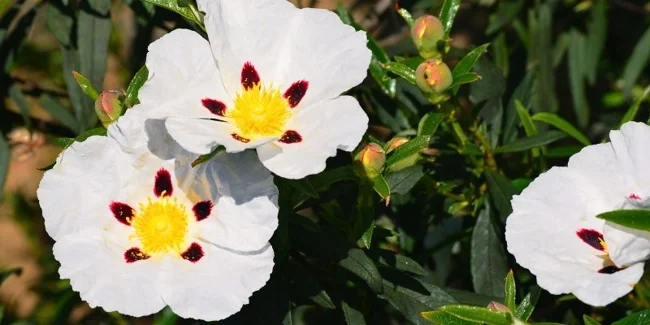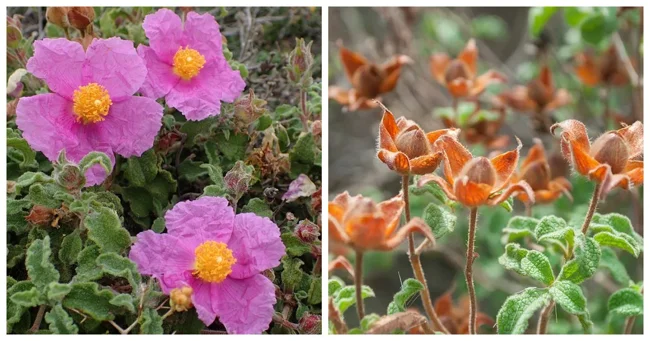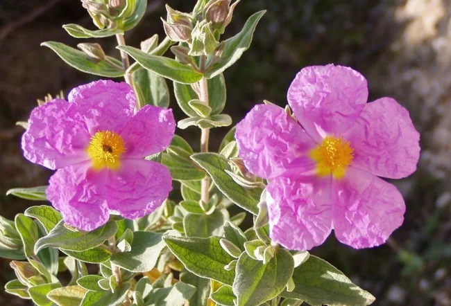 Cistus flowers are quite simple, with five petals and similar to ordinary rose hips. For this reason, the plant is often called rock rose. They smell wonderful, but they only live for one day. After which the petals fly off to give life to the next flowers.