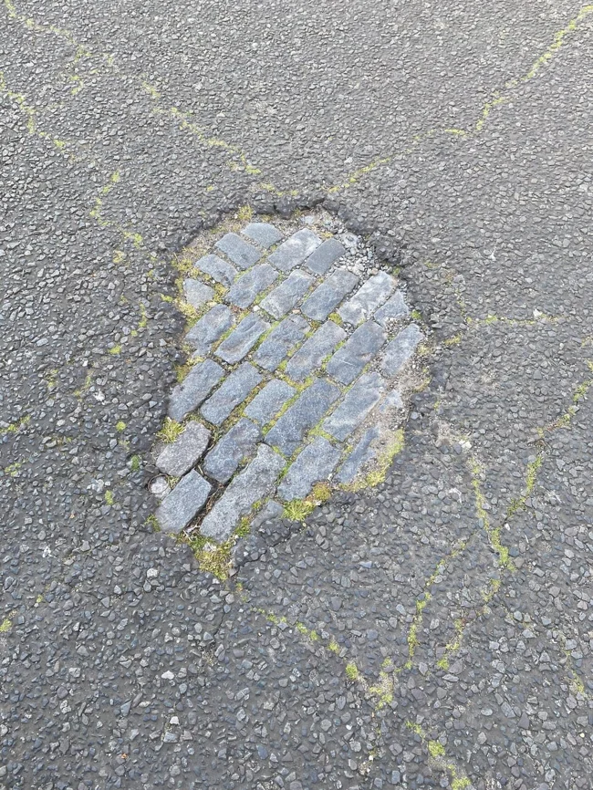 15. The asphalt was so destroyed by traffic that the paving stones that were underneath were exposed. ![]()