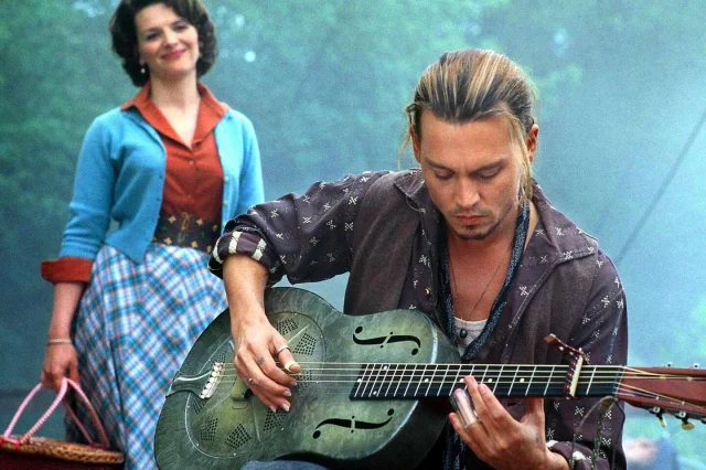 A minor, but very bright role of Depp in the film about the chocolate magic of a girl named Vienne Rocher, who settles in a small French town and changes it greatly.