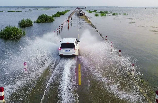 This road is located in China and runs through Poyang Lake. It has a different frequency of water coverage than its predecessors. During the rainy season, which begins in May, the water in the lake rises, and for several months, until September, the road will be completely hidden under water. At first, the water level will not be high, and cars will be able to drive and people will be able to walk, guided by the high posts along the edges of the road. But after another couple of weeks of continuous rain, there will be so much water that drivers will be forced to look for alternative routes. ![]()