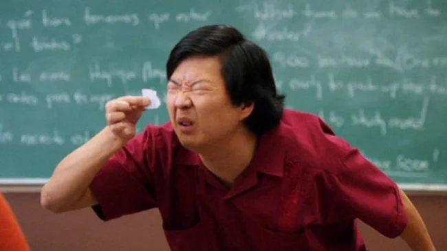 Community is a series about the lives of college students. The hero of the meme, Spanish teacher Señor Chang, discovered a tiny cheat sheet on the floor and is trying to find its owner. The expression on the teacher's face turned out to be so funny that it was immediately used in situations where you need to describe something incredibly small.