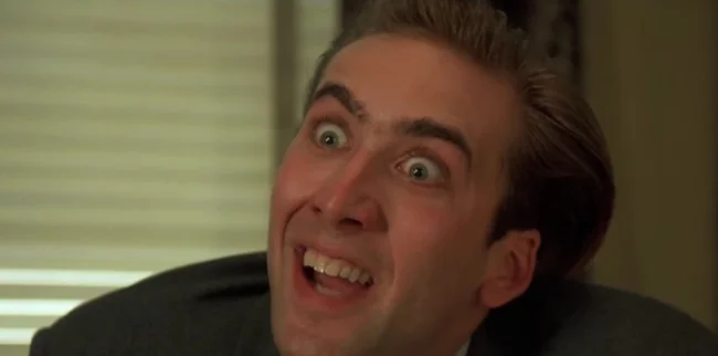 In the movie “Vampire's Kiss,” Nicolas Cage made such a face that he immediately ended up in memes. A shot of this moment is used when the interlocutor said something so obvious that you are simply amazed.