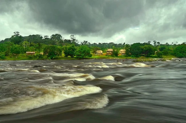 River Palumeu in Suriname. At this point it is wide and raging, but the team's base camp was much further upstream, where the Palumeu River was so narrow that the scientists could cross it on a fallen tree: