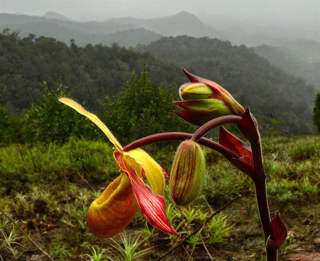 This orchid (Phragmipedium lindleyanum) is one of several rare and beautiful orchid species discovered on the top of a previously unexplored mountain called Grensgebergte. (Photo by Trond Larsen | Conservation International):
