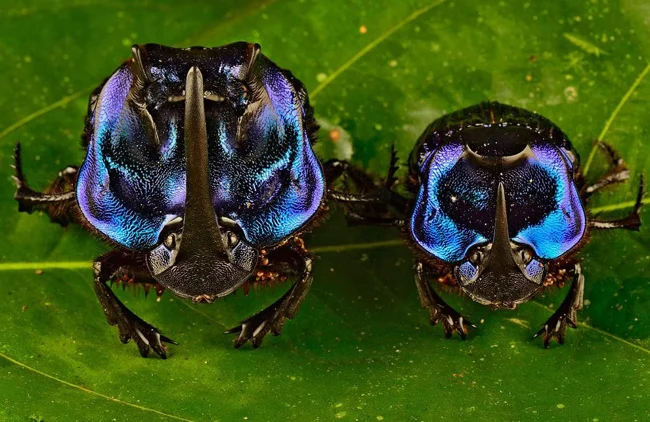 Coprophanaeus lancifer are the largest of all dung beetles in South America. Both males and females have long horns on their heads, which they use when fighting with others of the same sex. The huge difference in size is primarily determined by how much food was available to the developing larvae. (Photo by Trond Larsen | Conservation International):