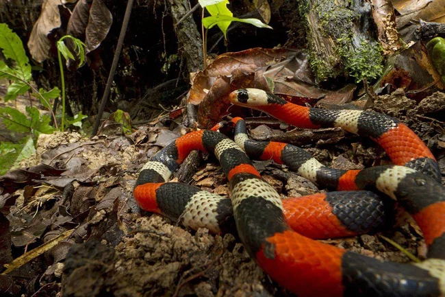 The bright colors a la the coral snake give Erythrolamprus aesculpi protection from predators, although this snake lacks the deadly venom that real coral snakes have. This is one of 19 snakes found during the expedition. (Photo by Piotr Naskrecki | Conservation International):