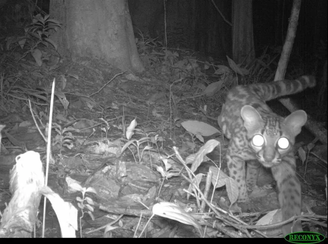 Because many mammals are so elusive and difficult to see in the forest, scientists use automated camera traps. The camera detects the animal using an infrared sensor and releases the shutter. Of the 24 large mammal species encountered on the expedition, many were discovered using such camera traps. And this is a long-tailed cat (Leopardus wiedii). (Photo by Conservation International):