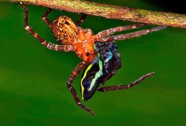 Suriname is not a paradise for all living creatures. This photo, taken during one of the scientists' night walks, shows a wolf spider dining on a frog. (Photo by Trond Larsen | Conservation International):