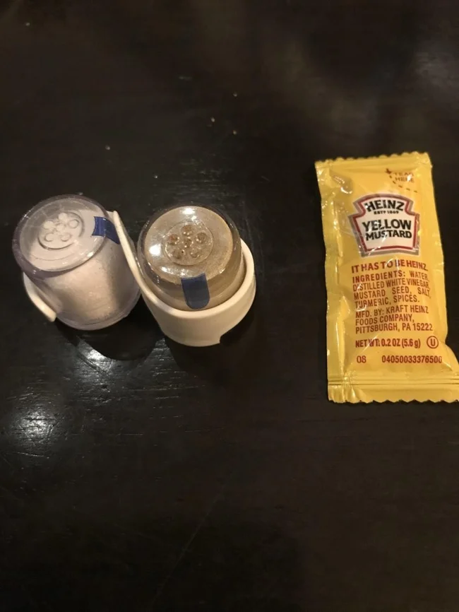 Small disposable shakers for salt and pepper, which are given to each client individually in the restaurant