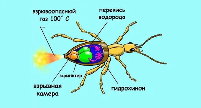 The glands produce a mixture of chemicals - hydrogen peroxide and hydroquinones. The first we all use in everyday life is ordinary peroxide, and the second is used in analytical chemistry for developing photographs, producing paints and medicines, and even as a tanning product. These substances enter two reservoirs, but during the production and storage stage they maintain the beetle’s body temperature—nothing dangerous yet. The other two reservoirs contain the enzymes catalase and peroxidase, which act as the spark in the entire firing reaction. The walls and valves of the storage facilities for these substances are very tight so that nothing mixes ahead of time and explodes.