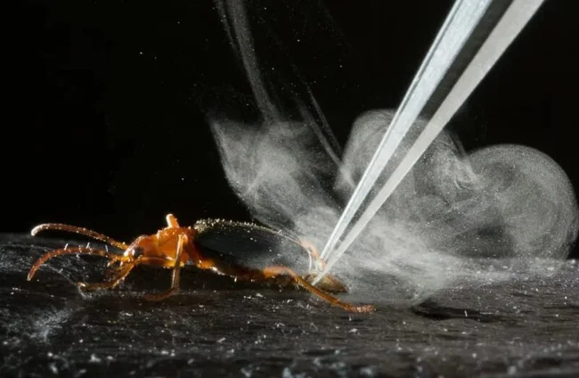 Insects have spent millions of years honing their skills - it's not just bombardiers who use chemical weapons as defense. Some species of beetles from the ground beetle family and the caraboid superfamily also acquired caustic secretions, but only the bombardier beetle evolved before the gunshot.