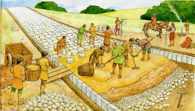 The best Roman roads were built in several stages. Workers first excavated about 0.9 meters into the area where the planned road would run. Wide, heavy stone blocks were then placed at the bottom of the trench, which were then covered with a layer of earth or gravel to provide drainage. Finally, the top layer was paved with slabs with a protrusion in the center to allow water to drain away. In general, Roman roads were about 0.9 meters thick and extremely resistant to the ravages of time.