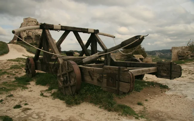 The Romans also invented their own siege engines called onagers (named after the wild donkey and its powerful kick) to throw large stones. Although they also used elastic animal sinew, onagers were much more powerful mini-catapults that were fired from a sling or bucket filled with round stones or flammable clay balls. They were much less accurate than ballistas, but more powerful, making them ideal for breaking down and setting fire to walls during a siege.