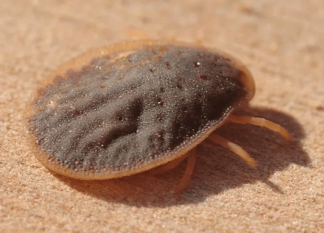 They are small in size, reaching 2.5 mm in length. The body is oval, with a dense plate at the top - the scutellum. In males it covers the entire back, in females only the front part. Color brown.