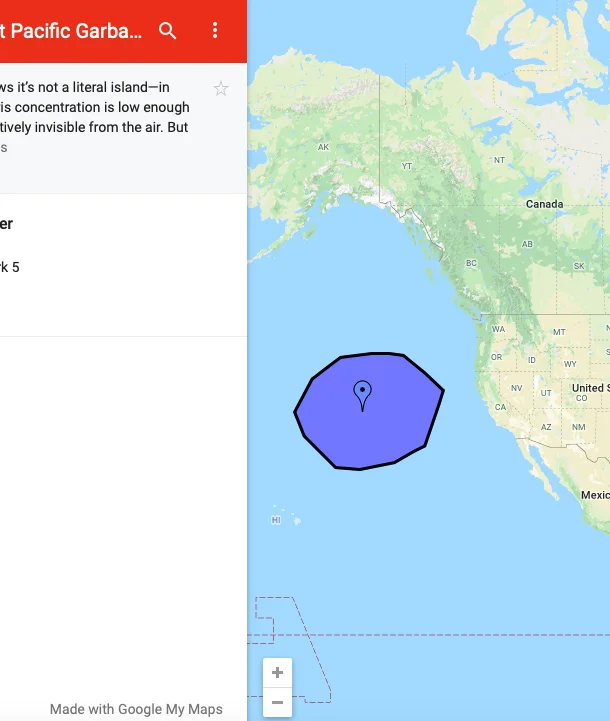 The Great Pacific Garbage Patch is located halfway between Hawaii and California (exact location can be found on Google Maps). It consists almost entirely of plastic and microplastics, which are not biodegradable. The surface area of this garbage “island” is 1.6 million square kilometers.