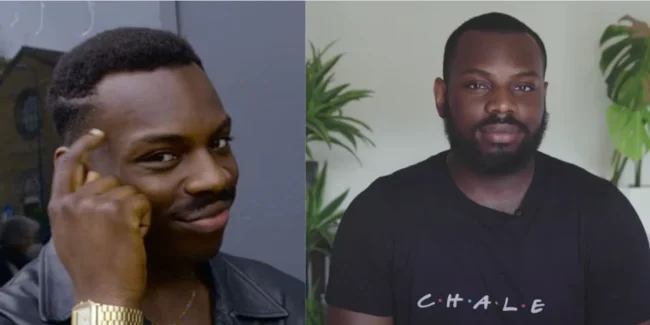 The meme comes from the 2016 BBC Three mini-documentary series Hood Documentary, in which the character, played by actor Kayode Ewumi, points to his head and smiles, saying he finds the woman beautiful because "she has a good brain." Now he is 27 years old.